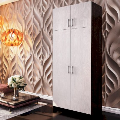 Функциональный двухстворчатый шкаф справится с размещением большого количества предметов одежды и аксессуаров. Модель разделена на две зоны, каждая из которых оснащена распашными дверцами. В большей части находятся полки и отделение с хромированной штангой. Часть поменьше представляет собой вместительную нишу для хранения. Изделие выполнено из ЛДСП.