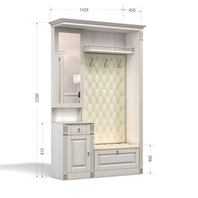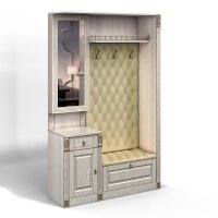 Прихожая выполнена в классическом стиле с декоративными элементами. Фасады и декоративные элементы патинированы, патина наносится вручную, по классической итальянской технологии и защищена матовым лаком. Мягкие элементы (вешалка и сиденье) выполнены из экокожи, декорированы каретной стяжкой.
