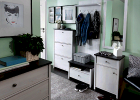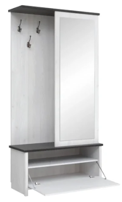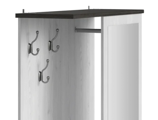 Шкаф разделен на 3 отделения: отделение с крючками для навешивания одежды, отделение со стационарной металлической штангой для одежды и отделение с полкой за откидной дверью