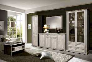 Стройный изящный шкаф-пенал универсален и практичен. В отличие от монолитного шкафа его можно интегрировать к любому модулю – к тому же шкафу (если в него не поместилось все задуманное), к витрине, к тумбе или к комоду. Можно «поиграть» высотой – поставить высокий пенал рядом с низкой тумбой, добавить наш закрытый пенал к открытой витрине, тем самым добавив «воздуха» в конструкцию и сделать ее более легкой. А если банально не хватает места, то просто оптимизировать пространство. В общем, шкаф-пенал – настоящая находка! Дизайнеры разделили его на три части. Верхний модуль состоит из трех вместительных полок, каждая из которых выдерживает до 5 кг. Данная модель – идеальный вариант для небольшого холла или прихожей. На верхние полки мы размещаем головные уборы, перчатки, зонты, выдвижной ящик удобен для документов, счетов и ключей, а также мелочей, которые необходимы при входе и выходе в квартиру или дом. Две нижние полки отлично подходят для обуви – как уличной, так и домашней. Благодаря современным технологиям дверцам и выдвижным ящикам не нужны доводчики – они легко и дружелюбно распахиваются и выдвигаются навстречу  по первому желанию хозяев. Шариковые направляющие обеспечивают очень плавный ход. Дверцы и ящики снабжены металлическими ручками, которые учитывают анатомию ладони, поэтому ими очень удобно пользоваться. Что помещается в пенале – известно только вам, ведь все фасадные дверцы – закрыты!