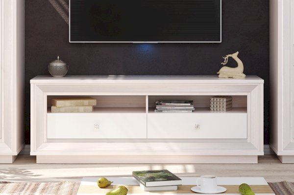 В модульной коллекции «Прато» в стиле Ар-деко вы найдёте широкий выбор ТВ-тумб, различных по габаритам и конструкции. Данная модель имеет ширину 1364 мм, благодаря чему с легкостью поместит телевизор с большой диагональю, при этом не большая глубина 426 мм позволит не загромождать пространство. К данной тумбе идеально подойдёт навесная полка с такой же шириной.