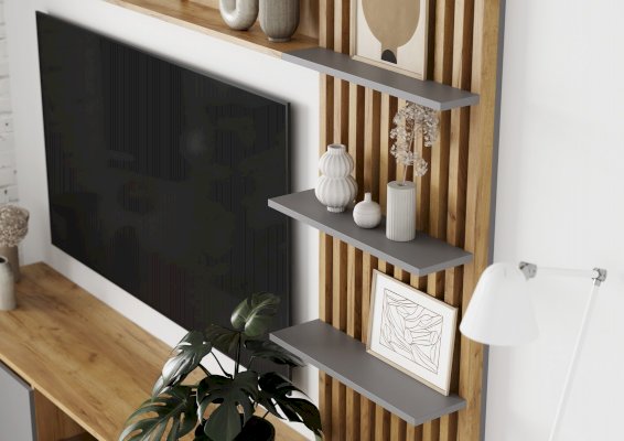 • Ниша под телевизором оборудована стеклополкой из тонированного стекла в цвете Графит, края обработаны еврокромкой