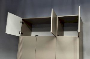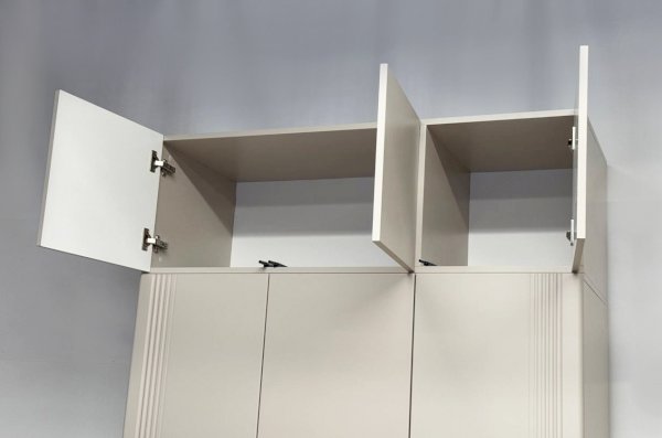Особое внимание заслуживает фрезеровка фасадов, которая придаёт антресоли изысканный вид. Толкатели PUSH вместо ручек обеспечивают удобное открывание нажатием.