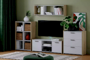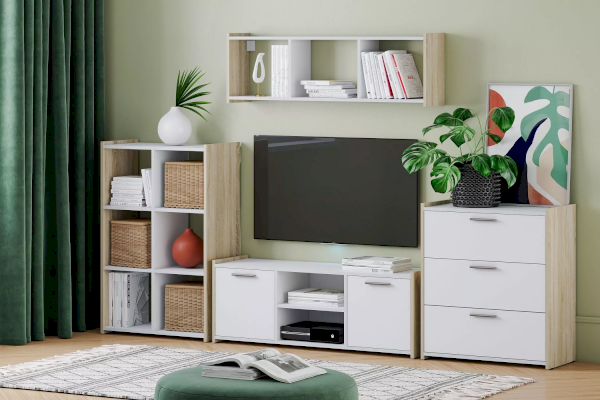 Тумба ТВА Симпл выполнена в скандинавском стиле и имеет малые габариты, что делает ее функциональной и стильной. Характерная особенность тумбы - комбинация открытых полок и ящиков. На полках можно разместить предметы декора и книги, а в ящиках за распашными дверями расположить все необходимые мелочи.
