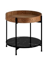 Круглый журнальный столик в современном минималистичном дизайне впишется в любой интерьер. Столешница выполнена из МДФ и покрыта шпоном из ясеня. Высокие бортики по краям предотвращают падение предметов со столика. Нижняя полка из МДФ с рисунком под мрамор идеально подойдет для хранения книг или журналов. Черный металлический каркас выдерживает нагрузку до 50 кг. Пластиковые подпятники в основании ножек защищают напольные покрытия от царапин и предотвращают скольжение.