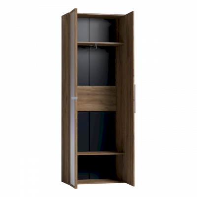 Двухдверный распашной шкаф с одним глухим фасадом и одним зеркальным фасадом в раме. Глухой фасад с серой ручкой из массива, фасад Зеркало Контур открывается за ручку-петлю из высокопрочной микрофибры. Регулируемые опоры компенсируют незначительные неровности пола.