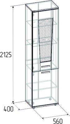 Шкаф для посуды Норвуд 13 - этот модуль создан для красивой посуды, хрупких сувениров. Высокий и узкий шкаф-пенал будет уместен в гостиной любых размеров. Фигурный фасад верхней витрины эффектно совмещает в себе тонированное стекло, ЛДСП и контрастную вставку в цвете Орех Шоколадный. Стеклянные полки из прозрачного стекла толщиной 6 мм. Благодаря модулю Подсветка ADELE 87, которую можно докупить отдельно, теплый свет будет приятно подсвечивать посуду в витрине. В нижнюю закрытую тумбу посудного шкафа можно убрать вещи, не предназначенные для посторонних глаз. Фасады шкафа перевешиваются на левую и правую сторону.