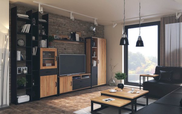 - Левая секция состоит из 7 открытых полок. Расстояние между полками 338 мм.