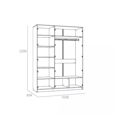 С комбинированным шкафом Livorno НМ 013.57 Х в спальне не придется устанавливать дополнительную мебель для хранения одежды. В левой части модуля находится секция с пятью полками для белья. Правую часть шкафа занимает отделение с овальной штангой, которая способна выдержать много тяжелой верхней одежды. Антресольная полка подходит для хранения объемных вещей, а нижняя полка – для размещения коробок с обувью. Зеркальный фасад расширяет функционал шкафа и увеличивает пространство комнаты.