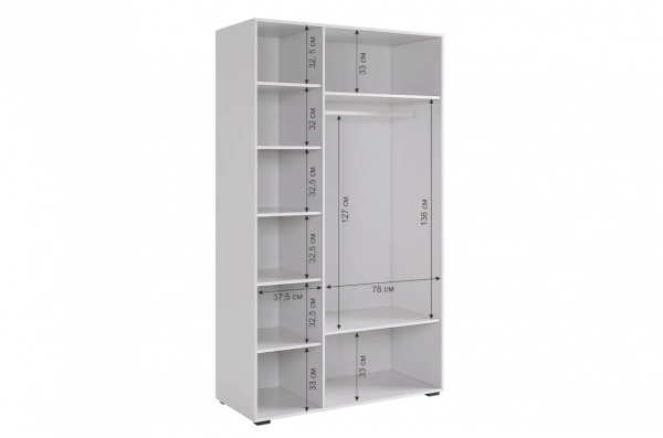 Шкаф Ева 105.01 имеет две секции - одну с штангой и двумя полками, и вторую с пятью полками, что позволяет эффективно организовать хранение одежды, обуви и других необходимых вещей. Благодаря бесшумному закрыванию фасадов, вы не будете беспокоиться о создании лишнего шума при использовании шкафа.