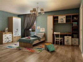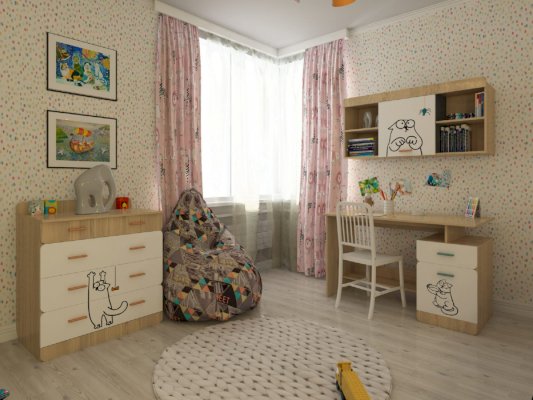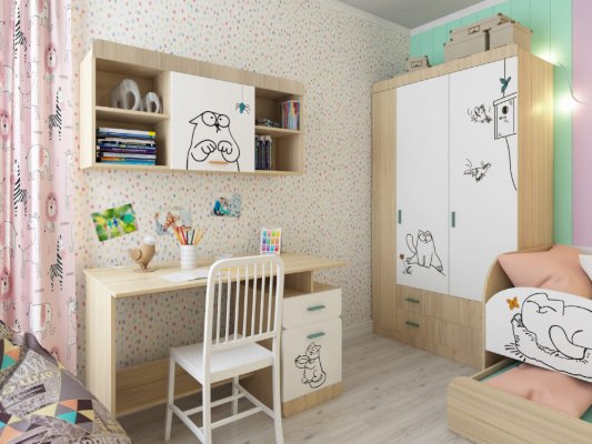 Детская «Кот» - удобная и безопасная мебель для вашего ребенка. Яркий принт на мебели создаст атмосферу в детской комнате. Каждый модуль комплектуется ручками двух цветов, что даст Вам прекрасную возможность, выбрать более подходящий цвет для вашего интерьера.