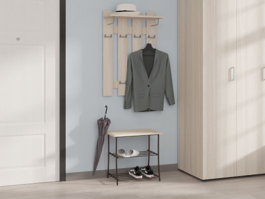 Удобная и гармоничная вешалка для одежды, помимо крючков для одежды имеется полка для головных уборов.
