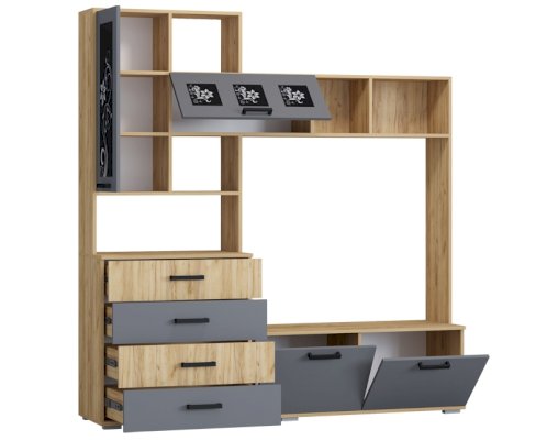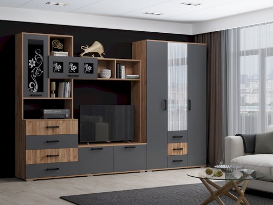 • Оснащена комодом, тумбой под ТВ, стеклостворкой под книги или посуду и полками под различные мелочи.