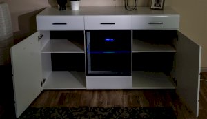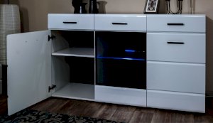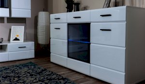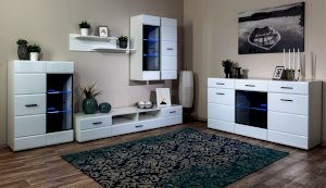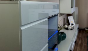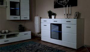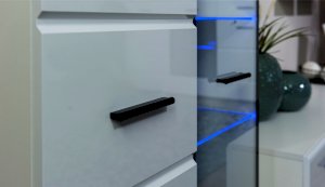 Светодиодная подсветка синего цвета для полок 2 класса Йорк подойдет к навесному пеналу-витрине 02 и комоду с витриной.