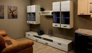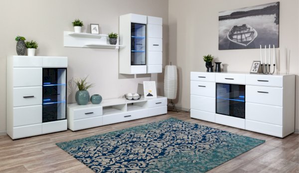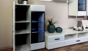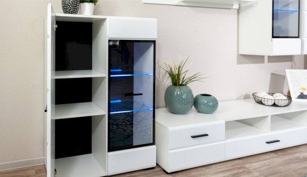 Модульная система Йорк выполнена в стиле минимализма. Строгие, лаконичные линии подчеркивают элегантность комплекта. Белый цвет мебели с деталями глубокого черного визуально сделает комнату светлее, просторнее и позволит составить безупречный по стилю комплект мебели. Сочетание глянцевой и стеклянной поверхностей, открытых полок создадут уютную обстановку и позволят украсить убранство комнаты приятными мелочами и разместить любимые книги и фото. Светодиодная подсветка придаст индивидуальность Вашей мебели. А широкая тумба для ТВ с выдвижными ящиками на телескопических направляющих позволит удобно разместить телевизор любой диагонали и другие медиаустройства Модульная система позволит подобрать по размеру вариант именно для Вашей комнаты, не оглядываясь на фиксированный размер, как в других стенках. Мебель выполнена из экологически безопасных материалов.