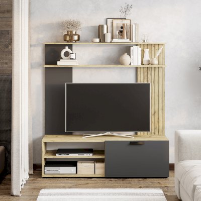 Гостиная "Мишель" - это модель с универсальной конструкцией для современного дома. Фасады в глубоком оттенке "графит" будут отлично контрастировать со стенами в нейтральных или насыщенных холодных тонах. Корпус и поверхности, выполненные в цвете "крафт", хорошо гармонируют с фотопечатью, имитирующей деревянные рейки.