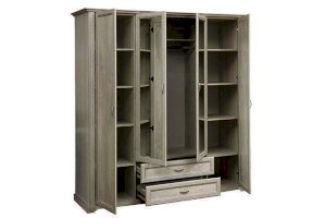 Данная модель – настоящая мини-гардеробная и отличная альтернатива целой комнате, ведь в нем поместится вся ваша одежда – и не только! Все в нем учтено до мелочей. Распашные двери – две глухие по краям и две зеркальные в центре – удобны и практичны. Внутреннее пространство продумано и зонировано. По краям, справа и слева расположились полки, на которых можно разместить одежду, а также коробки-боксы с вещами или обувью. В каждом отсеке находится по 5 полок, что оптимально по высоте: четыре полки в свободной зоне доступа даже для человека с маленьким ростом, а пятая, верхняя – для тех, кто повыше. Так что, если вы обладаете высоким ростом, у вас есть явные преимущества – это будет только ваше пространство! Каждая полка выдерживает до 5 кг – это достаточно для большого количества вещей. Глухие двери скроют от посторонних глаз то, что для них не предназначено. Центральные дверцы шкафа – зеркальные, это избавляет владельцев шкафа приобретать отдельное зеркало. Наверху расположена удобная горизонтальная полка, которая служит в качестве антресоли, куда можно убрать сезонные вещи, либо предметы, которыми хозяева пользуются не так часто. Центральный отсек снабжен металлической штангой, которая выдерживает вес до 20 кг, и предназначен для одежды на вешалках. Можно надеть любимое платье или костюм, закрыть шкаф и тут же оценить себя в зеркале. Очень удобно! Два выдвижных ящика под центральным отсеком подойдут как для вещей, так и для обуви – это зависит от помещения, где расположен шкаф. Если он находится в спальне, то в ящиках можно разместить белье – один отсек для НЕЕ, другой – для НЕГО, а если в холле или в прихожей, то в ящиках поместится обувь всей семьи. Благодаря современным технологиям дверцам и выдвижным ящикам не нужны доводчики – они легко и дружелюбно распахиваются и выдвигаются навстречу  по первому желанию хозяев. Шариковые направляющие обеспечивают очень плавный ход. Дверцы и ящики снабжены металлическими ручками, которые учитывают анатомию ладони, поэтому ими очень удобно пользоваться.