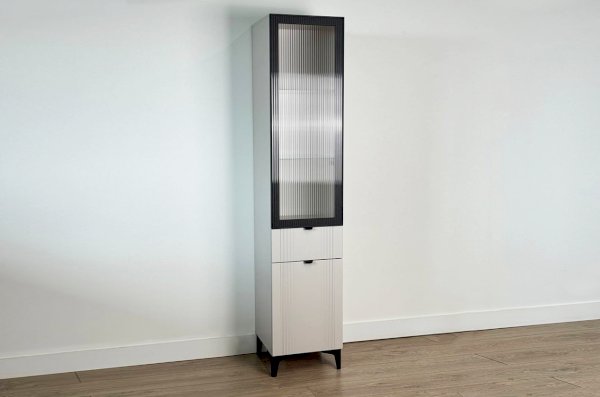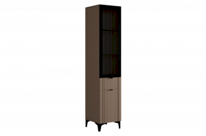 Шкаф оснащён надёжной металлической ручкой и имеет удобное внутреннее наполнение: надёжные полки за стеклянной и глухой дверцами, а также выкатной ящик. Это позволяет рационально использовать пространство.