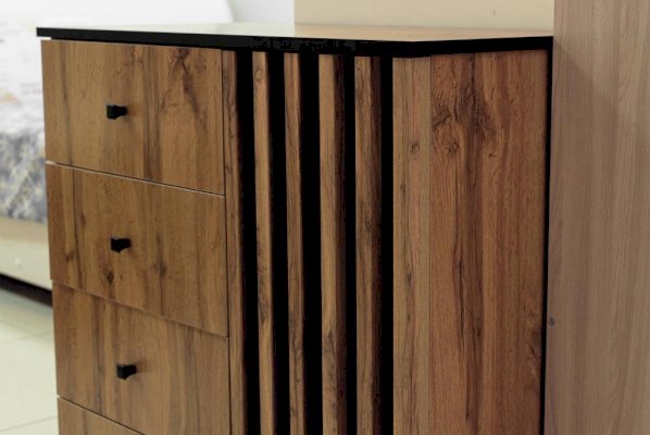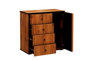 Четыре ящика расположены слева – один под другим. Внешне они кажутся небольшими, но на самом деле достаточно вместительны. В зависимости от тематики помещения в них можно разложить бумаги, документы, нижнее белье, полотенца. Справа, за распашной дверцей, два отделения. Сюда можно убрать постельное белье, подушки и одеяла – места для этого вполне достаточно. На верх комода можно поставить телевизор, а если повесить над ним зеркало и на столешнице расставить духи и косметику, он превратится в туалетный столик!