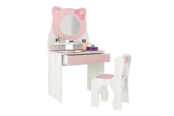Девочки любят во всем подражать маме. Отличным подарком для Вашей дочки будет комплект-трюмо с зеркалом, полочками, выдвижным ящиком и замечательным стульчиком в едином стиле.